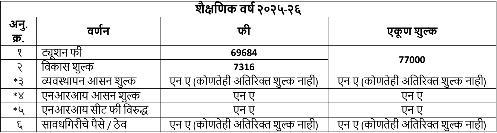 FRA - Fee Structure English Language Marathi Language Minority Language (Urdu) FRA 2025-26 View Detail Approved format for computation of fees for the academic year 2025-26 for PH stream View Detail FRA 2024-25 View Detail FRA 2021-22, 2022-23, 2023-24 View Detail